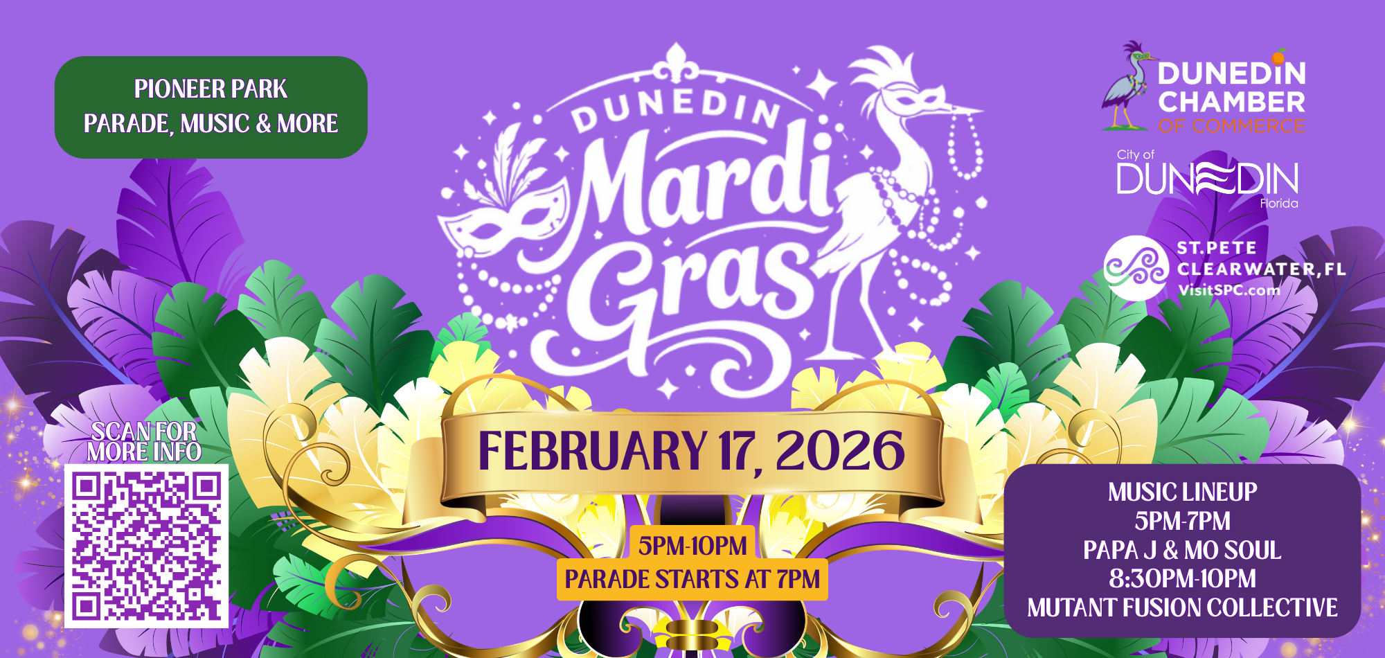 Dunedin Mardi Gras is proudly sponsored by Visit St. Pete-Clearwater. This is just the start of something unforgettable. Extend your stay to explore stunning beaches, local flavors, and can’t-miss experiences that make St. Pete-Clearwater the ultimate getaway. Plan your trip and find book the perfect place to stay on VisitSPC.com